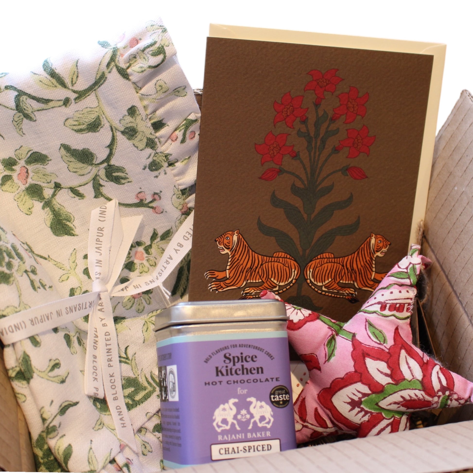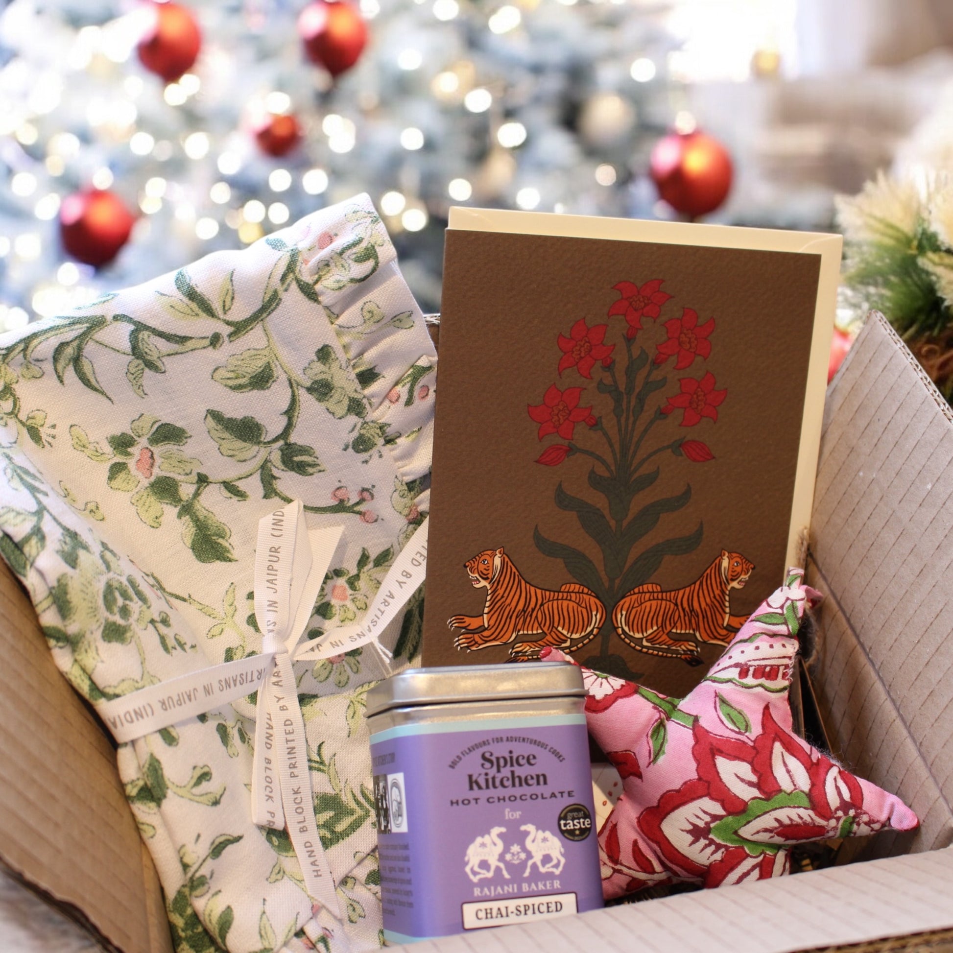 A bundle gift box with one each of: tiger & flower greeting card, block print ornament (random selection - may be a star, heart, or stocking), block print cushion cover, and chai-spiced hot chocolate tin.