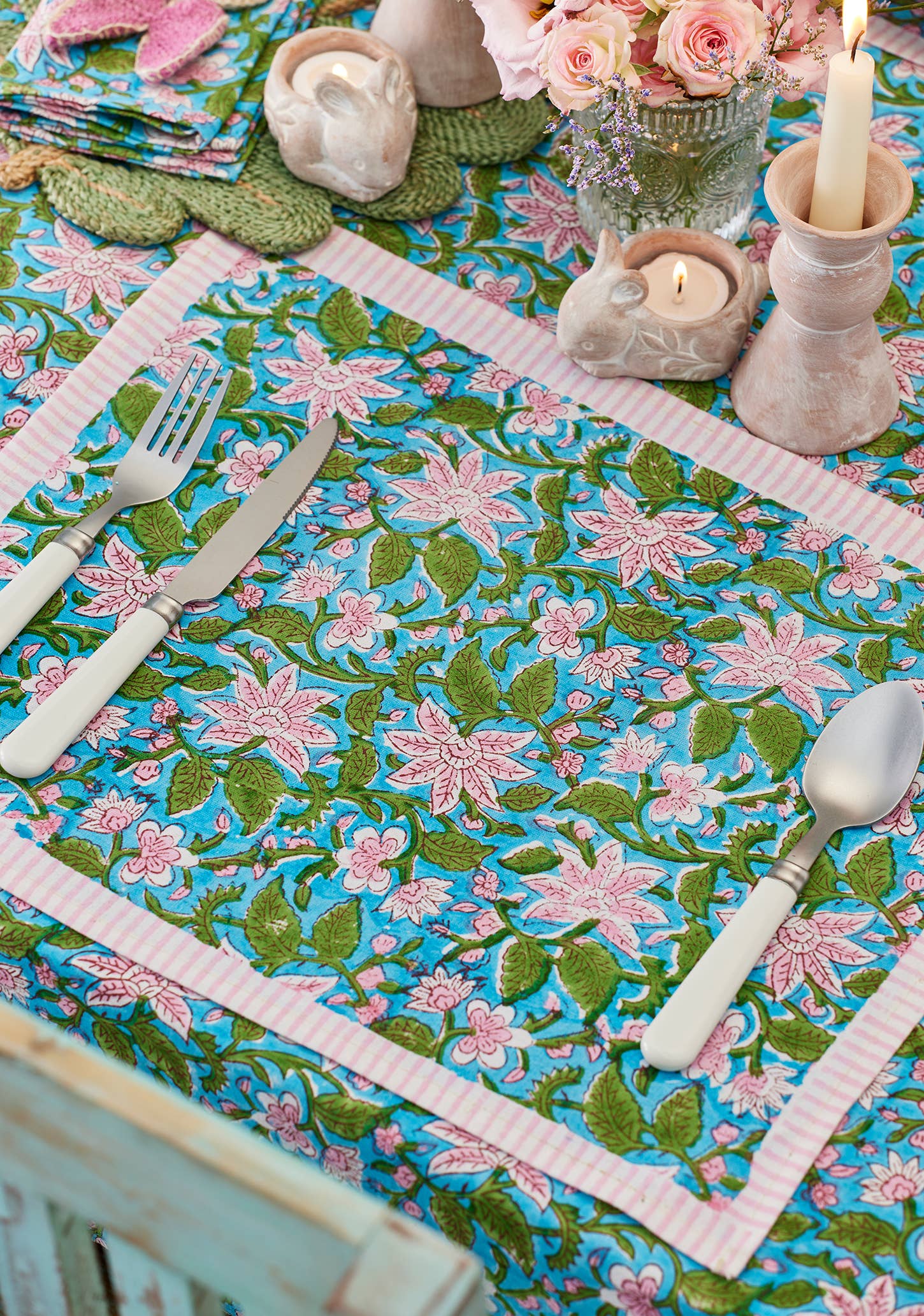 From a range of matching hand crafted table decorations, this rectangular placemat is block printed in a pretty lily design and bordered in pink and white stripes. This high quality artisan table dressing is eye-catching and of a substantial nature. Combine with other items to create a stunning place setting.