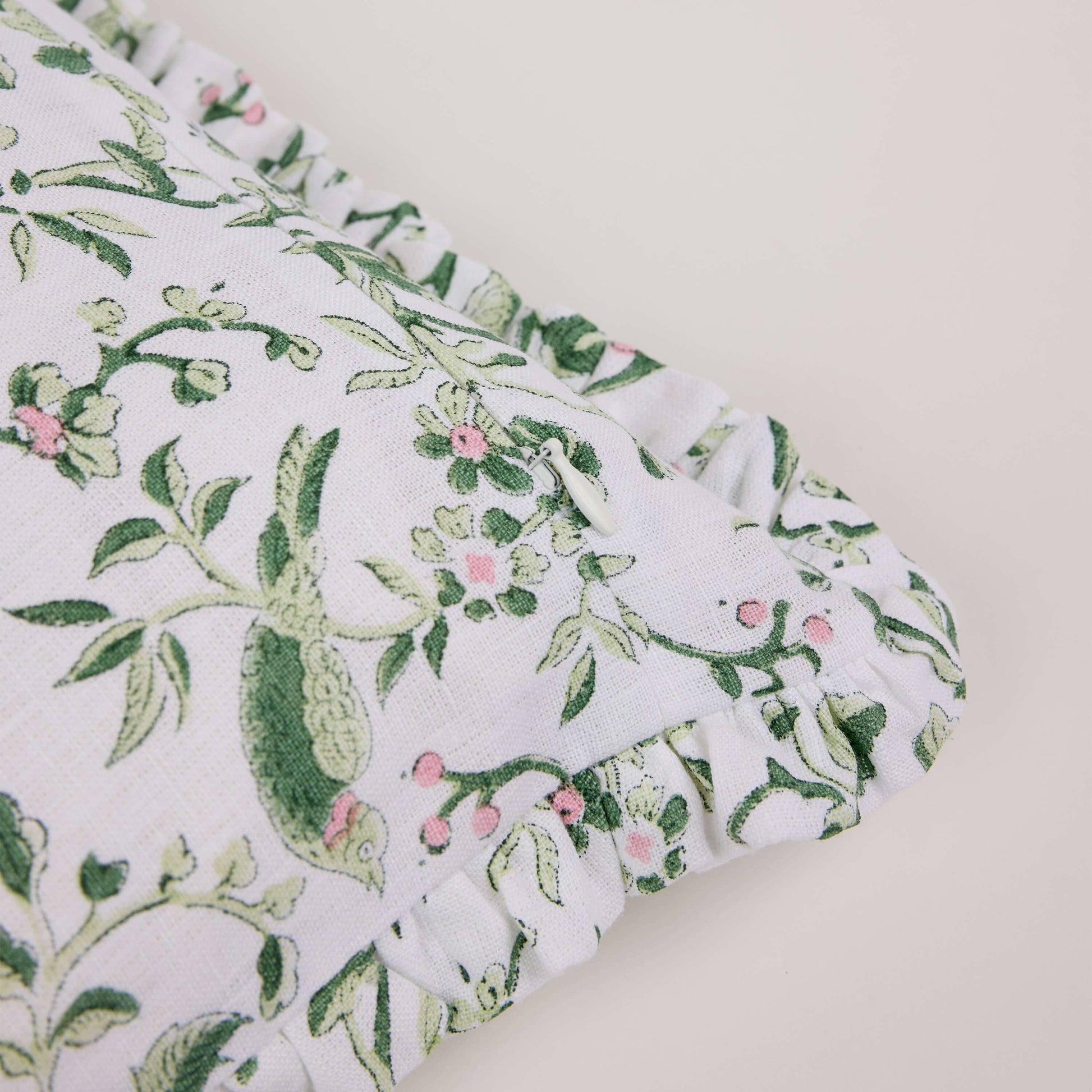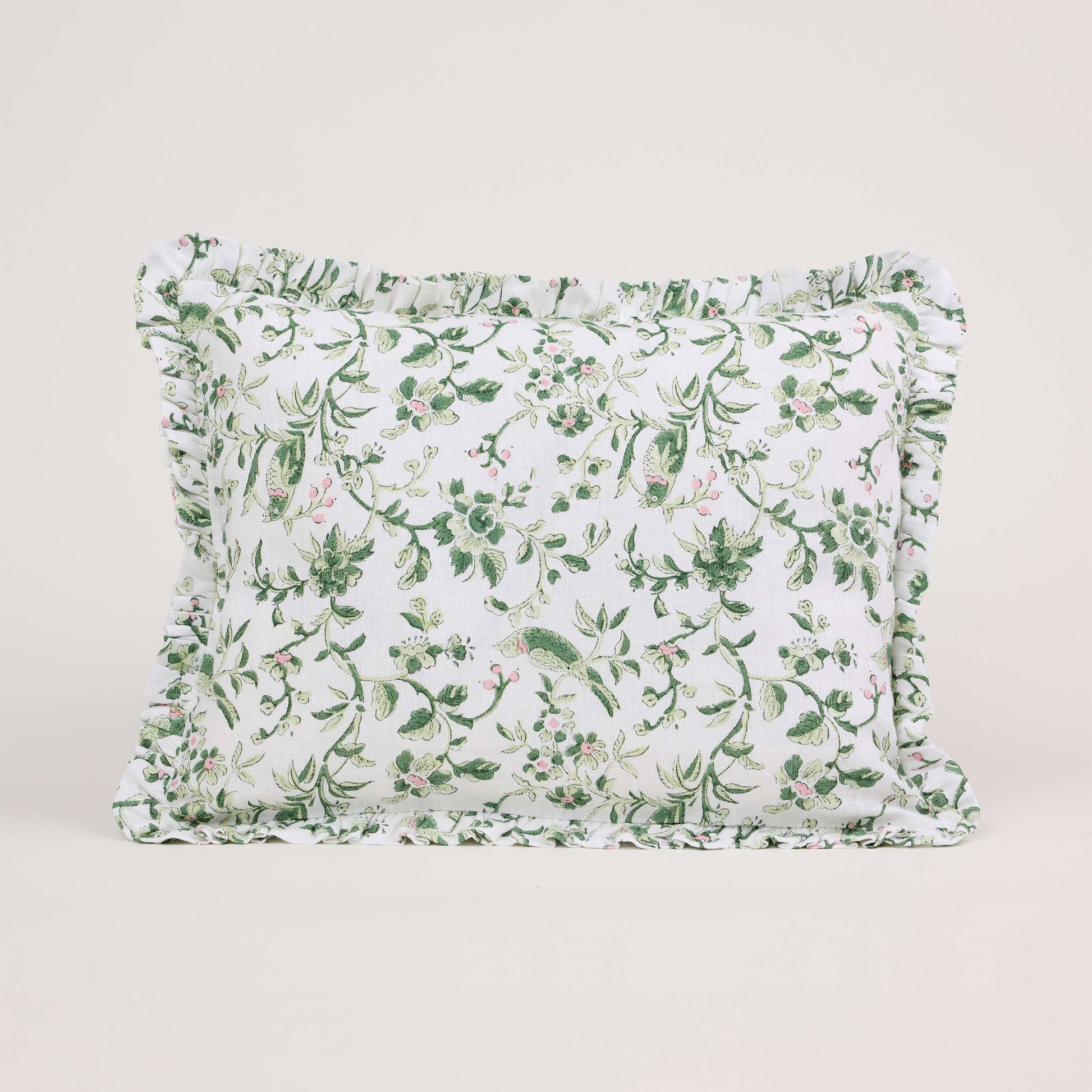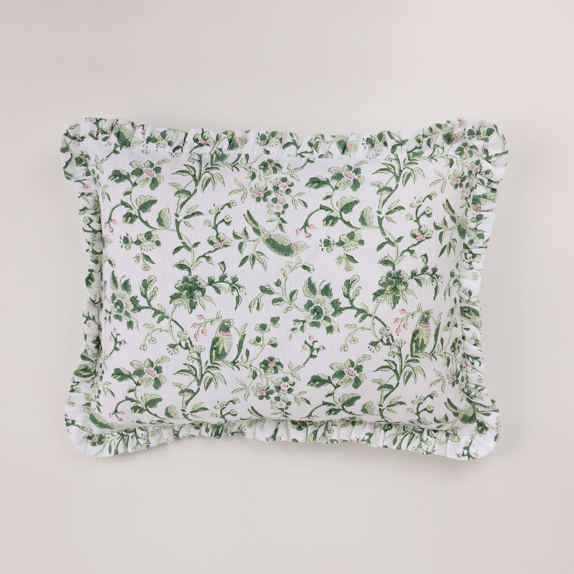Green Robin & Peony Block Printed Ruffled Cushion
