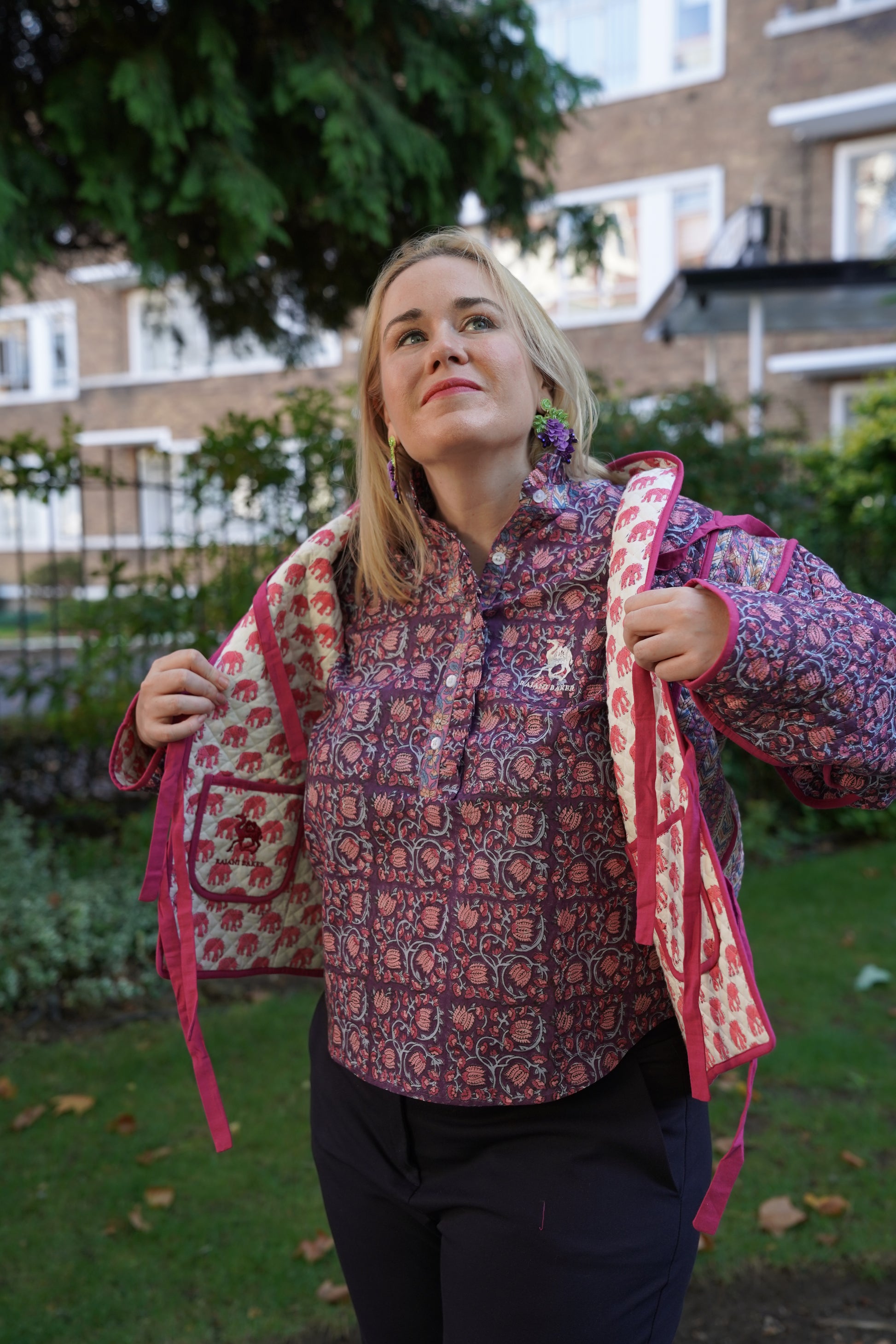 Hand-block printed reversible diamond quilted jacket. We made these extra thick to provide a good level of warmth for a cold autumn day. They are made with 100% cotton fabrics and are cotton filled. Our fabric is hand-printed from carved wooden blocks and each colour is applied individually. Because of this, some irregularities and imperfections may occur throughout the fabric - just a small reminder that your garment is made by a human whose sustainable, heritage craft you are helping to support! So, every piece is truly one-of-a-kind.