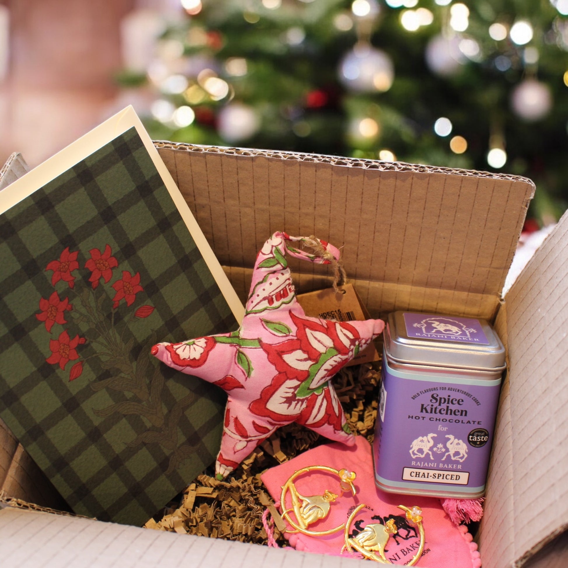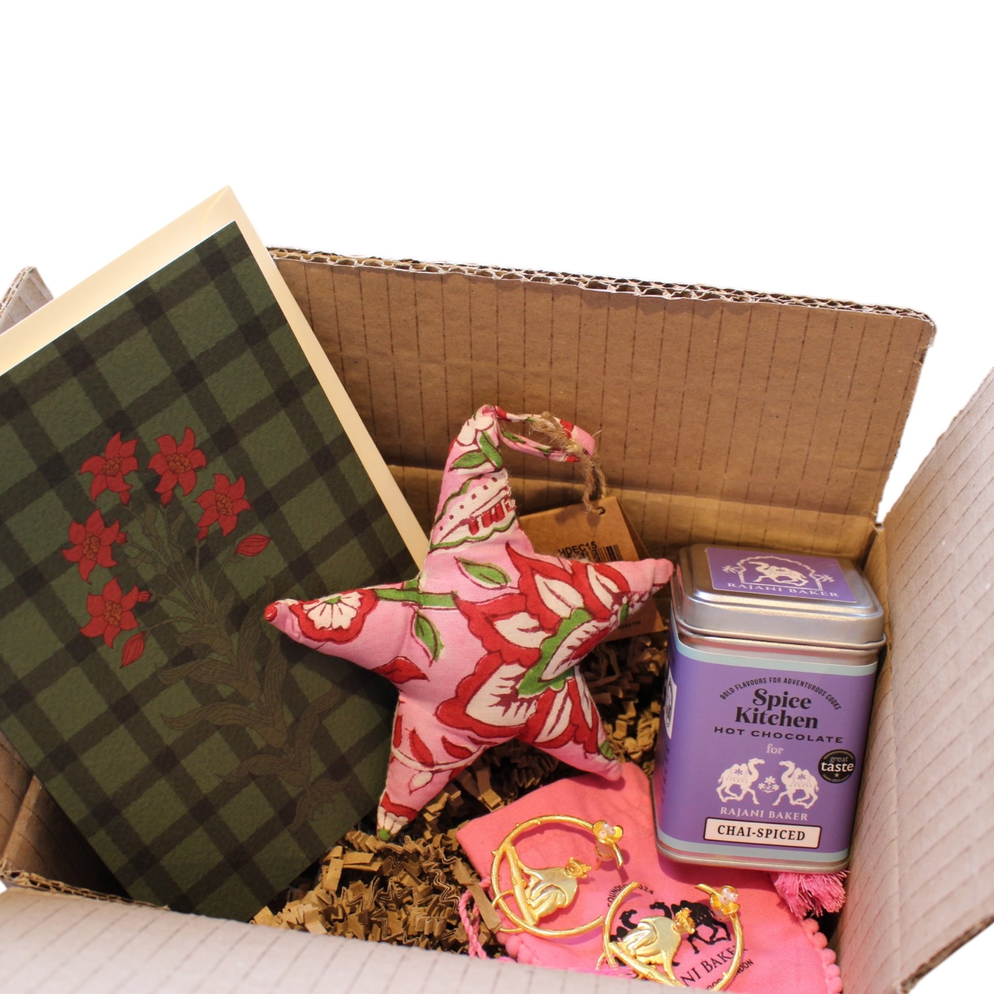 A bundle gift box with one each of: red flower with green squares greeting card, block print ornament (random selection - may be a star, heart, or stocking), monkey earrings, and chai-spiced hot chocolate tin.