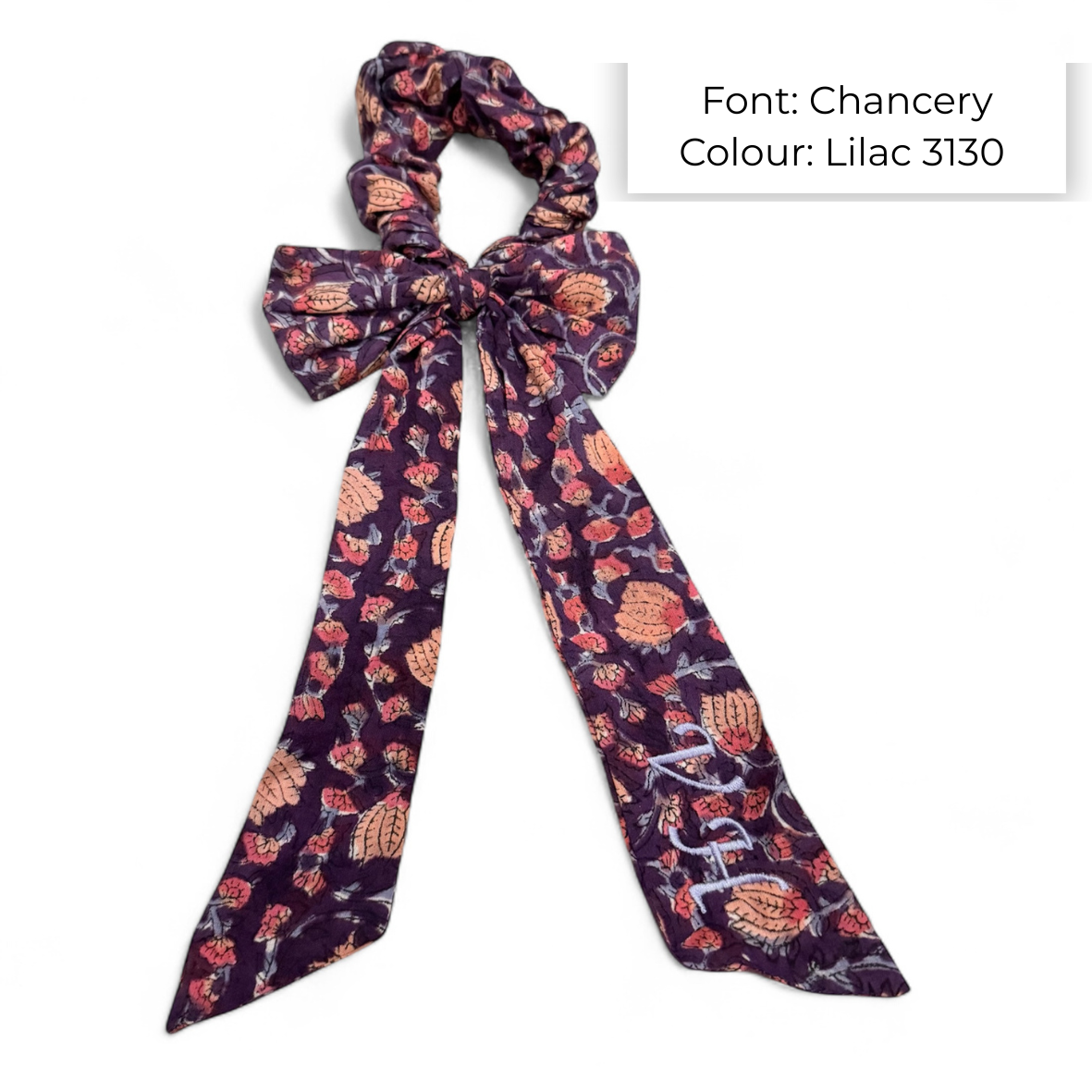 - For the Rani Bow Scrunchies: You can have a 1-3 letter monogram or any other word up to 3 letters long. Please note that the monogram threads are visible on the reverse side. While most customers don't mind this, it can show from the front depending on how you style the bow.